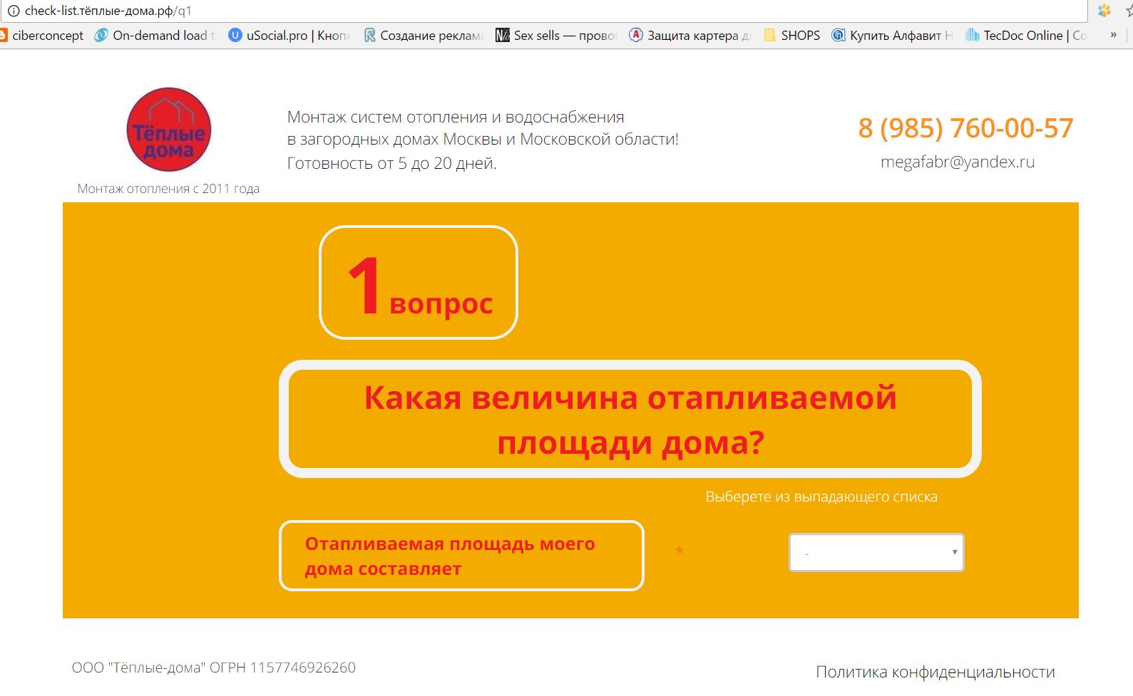 И что мы видим? Почта @yandex.ru, телефон МТС, просто ужаснейший логотип и очень странного вида landing-page. Ну а что, его же пенсионер делал, для которого лендос — не космические технологии. Но самое тупое, что он не работает. На сайте у них «всего один вопрос», на который я пытался ответить раз 20 в разных браузерах и у меня не получилось. Решил позвонить. В выходной они трубку не взяли, хотя для долларового миллионера должно быть очевидным, что деловые люди дома строят по выходным, а в рабочие дни на эти дома зарабатывают. Ну в общем, врайнье на вранье. Но я пошел дальше.
