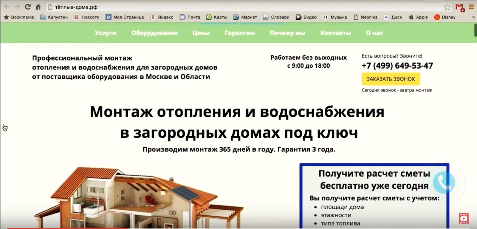 Неплохо подобраны цвета, телефон 499 (такой же используется у нас в магазине стеклоочистителей 2dvornika.ru), часы работы. Мне он даже понравился. 3D-модель дома, опять же. Выглядит достойно, логично, что вызовет доверие. Но я все же решил зайти на сайт со странным доменом .рф и странной буквой «йо» в назывании, и вот, что мы видим: