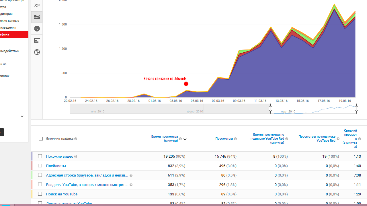 Схема была такая: я сделал видео по хорошему ключу, на следующий день сделал еще одно видео, и после этого начал лить Адвордс на первый ролик. Смысл в том, чтобы трафик попадал не только на посадочное видео, но еще и распределялся на новые через «Рекомендованный контент». Затем я делал видео и выкладывал их каждый день или через день в течение двух недель.